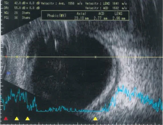 Figure 2: A B-scan of the patient’s right eye showing scleral thickening (white arrow).