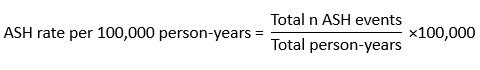 ASH rates are calculated for each sub-group (e.g., age, ethnicity) using total ASH events as the numerator and total person-years as the denominator.